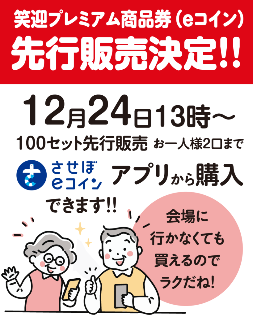 購入した笑迎プレミアム商品券(させぼeコイン)は、12月24日13:00から使用できます!